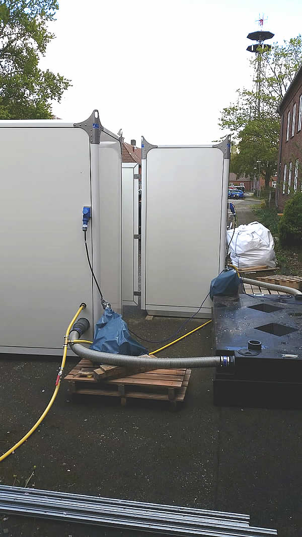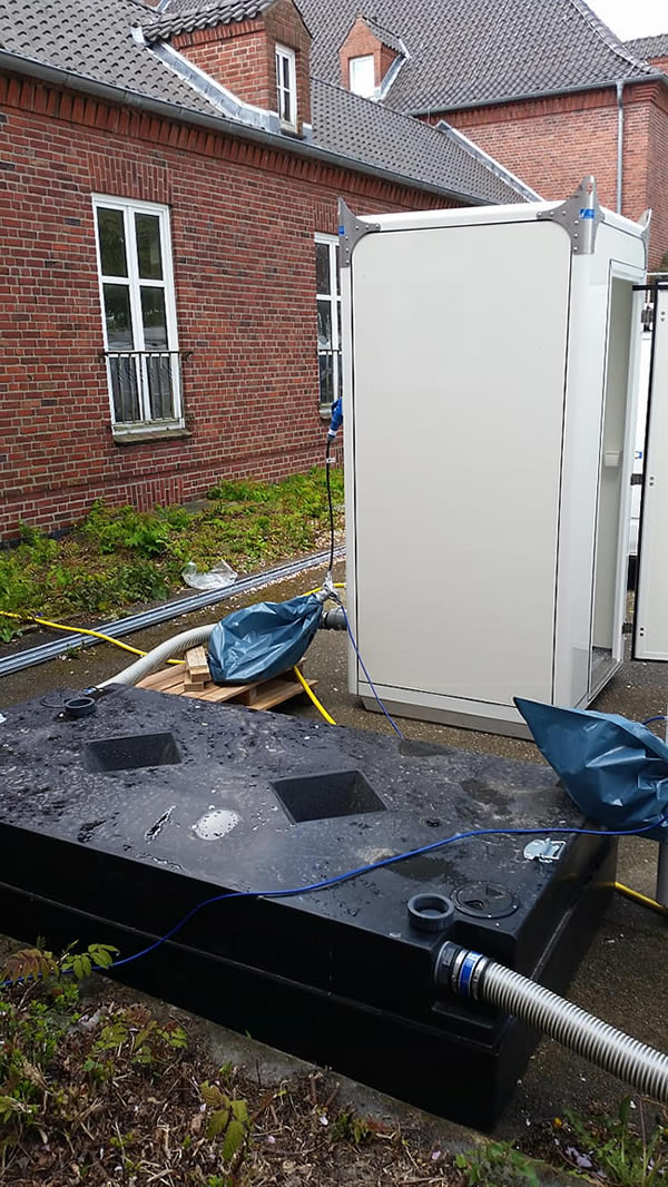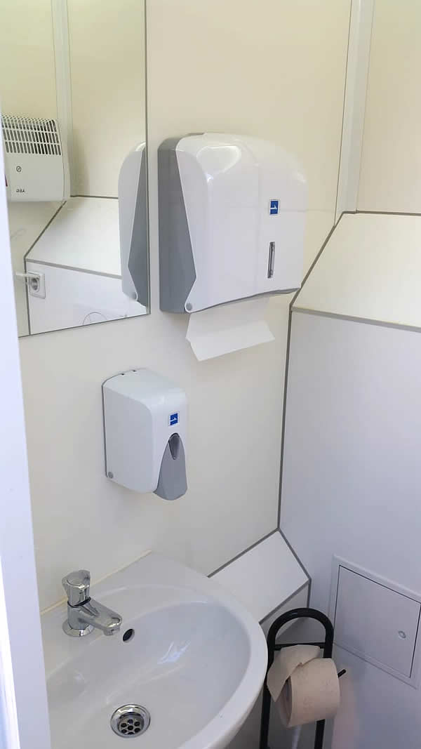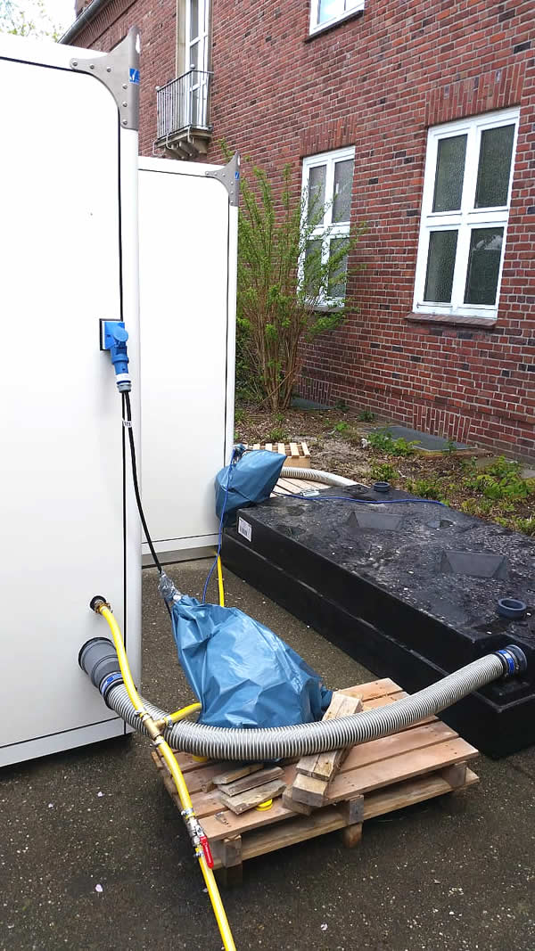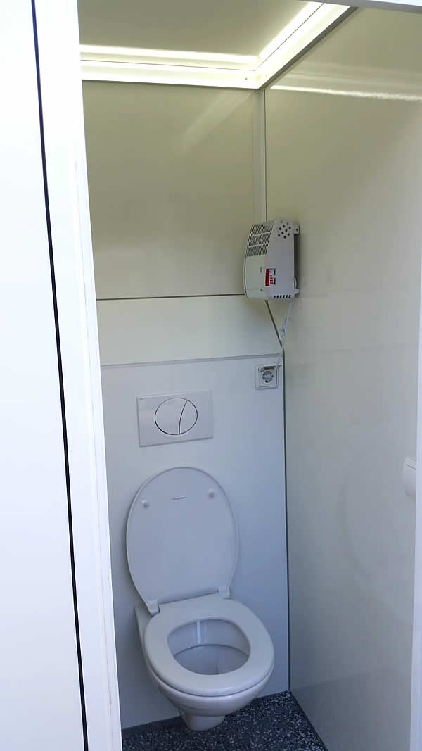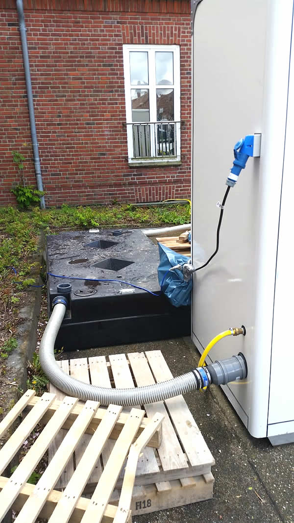 HINWEIS: Bei einer Aufstellung vor Ort ist ein Wasser.- und Stromanschluss notwendig, genauso wie bei einem Toilettenwagen.