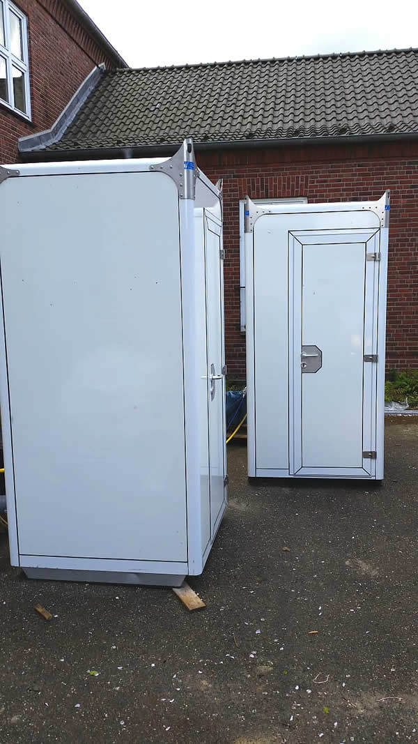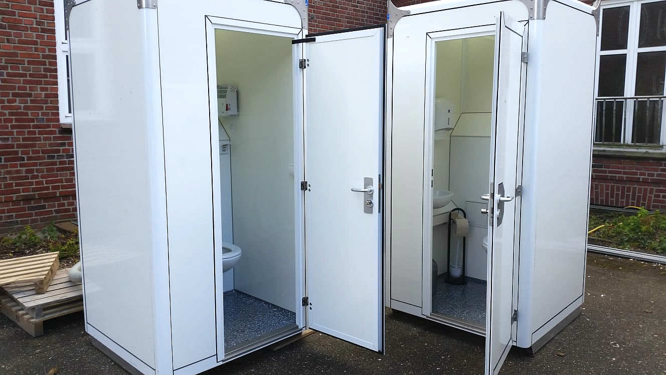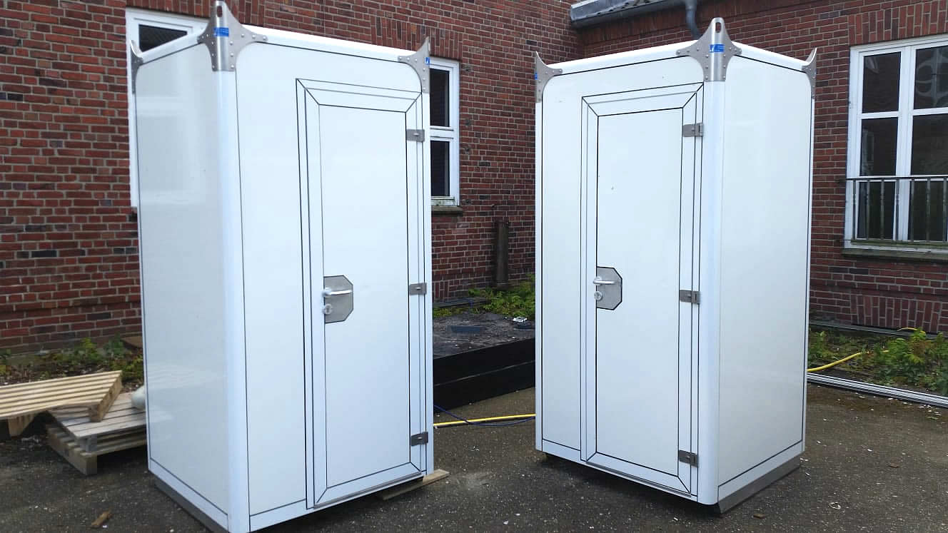 Die Aufstellung der Kabinen kann aneinander erfolgen, sodass sie aussehen wie ein großer Toilettenwagen.